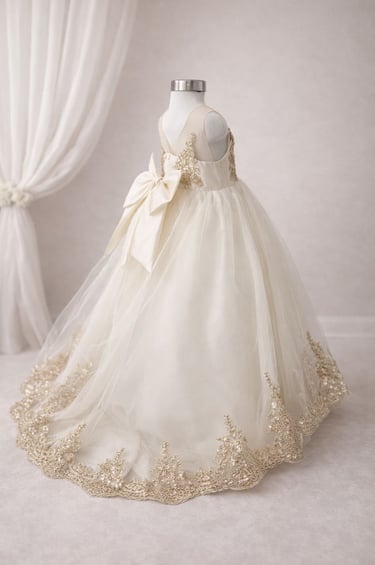 La Colección de Gala presenta vestidos de alta costura diseñados para eventos especiales, con acabados delicados y detalles que reflejan elegancia, distinción y encanto infantil.